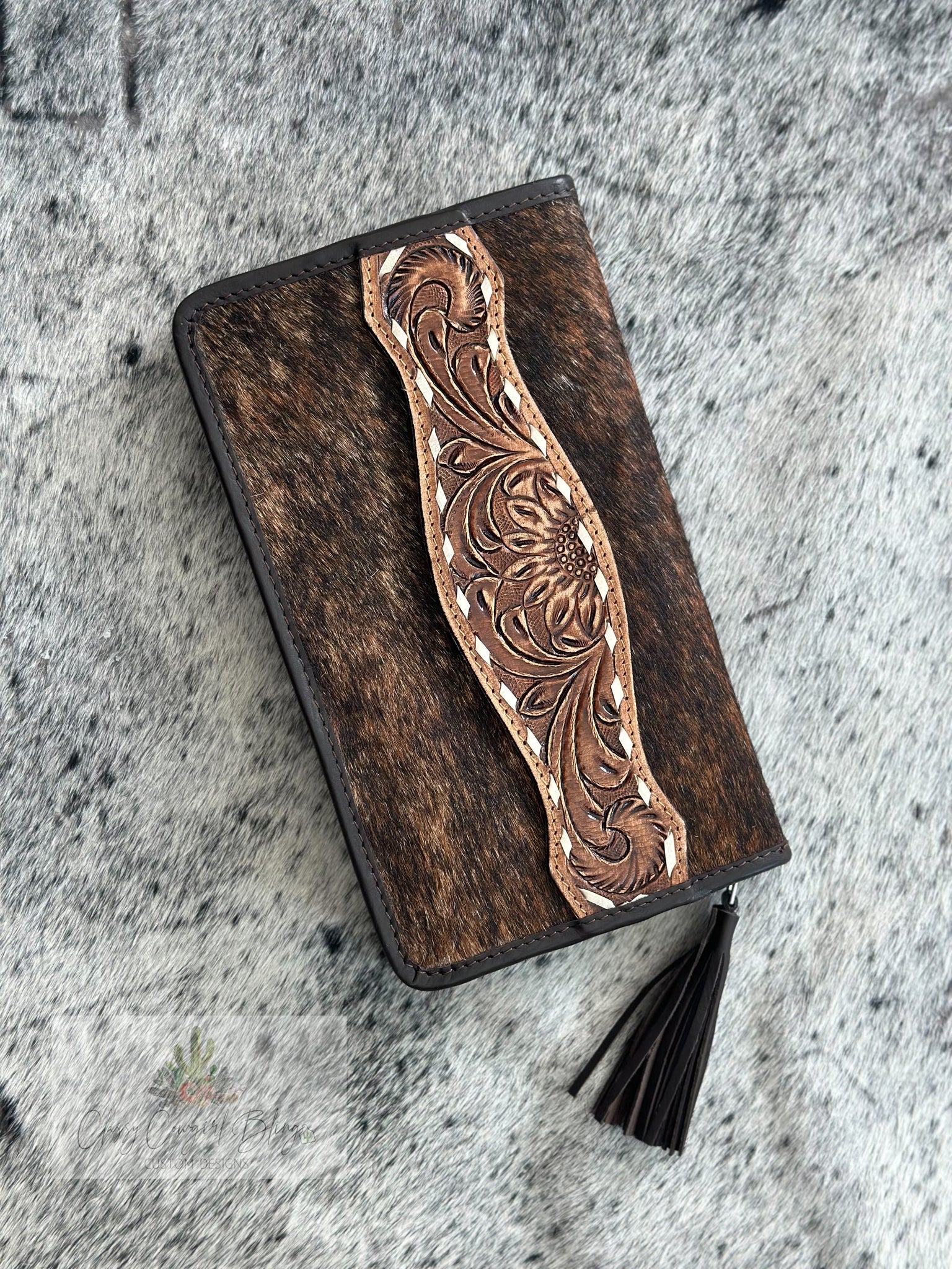 These are a top seller! Beautiful cowhide on both sized, with a tooled leather strap that allows for easy to carry.